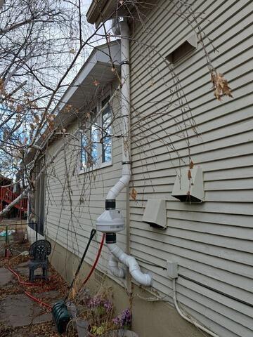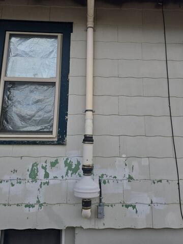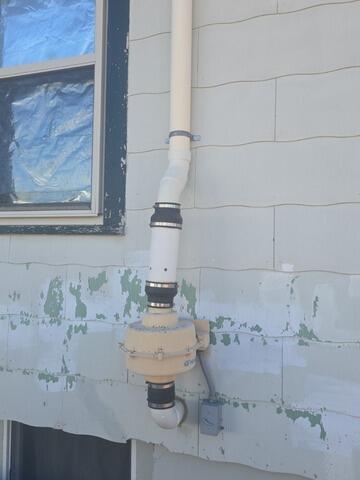 Our team completed an exterior radon mitigation system with a high-efficiency radon fan, and vent piping routed above the roofline for safe, continuous radon reduction.