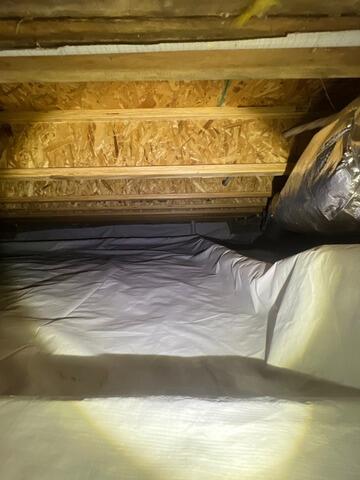 Before and after sealed crawlspace encapsulation featuring12 mil vapor barrier, sealed seams, and sealed to foundation wall.